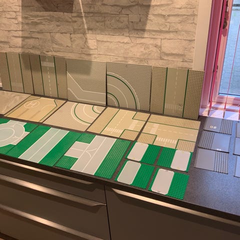 LEGO City vejplader i grøn og grå farve. Sættet indeholder forskellige vejsektioner, der kan bruges til at bygge og udvide LEGO City landskaber.