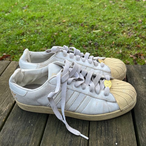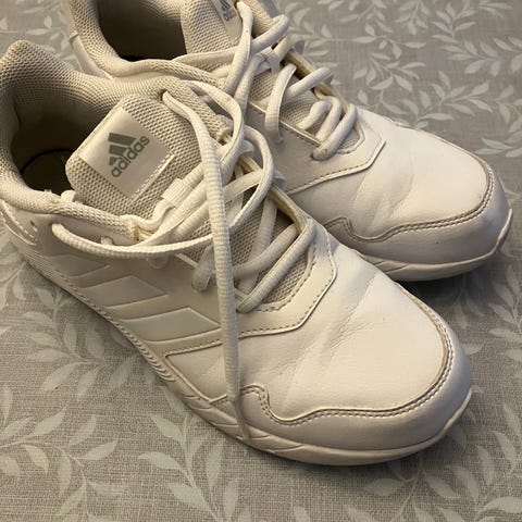 Adidas sneakers i størrelse 46,5. Skoene er hvide med klassiske Adidas striber og har snørebånd. Materialet er primært tekstil med gummisål. Velegnede til daglig brug.