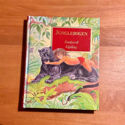 Rudyard Kipling Junglebogen bog med illustrationer. Indeholder historier om Mowgli, en dreng opvokset blandt dyr i junglen. Bogen er på dansk og indeholder indholdsfortegnelse og illustrationer relateret til fortællingerne.
