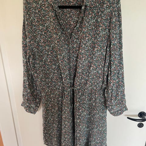Gennemknappet kjole i blød viskose, med lyseblå knapper, knapper på manchetter, knap på ærmet og indvendig strop så du kan rulle ærmerne op. Der er 2 brystlommer. Meget anvendelig kjole, brug den fx. med opsmøgede ærmer og et smart bredt bælte, eller som hyggekjole, den er behagelig og nem og at tage over sig, hvis du er et hyggemenneske, der ikke altid gider tage tøj på fra morgenstunden eller når du skal gå til stranden. Mrk. Bodyguide Orko-Tex 100% Viskose. Str. L / XL. Brystvidde 110 cm. Længde for 88 cm. Længde bag 102