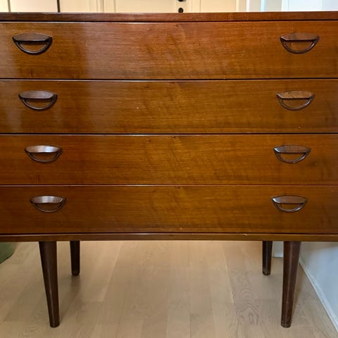 Pæn og velholdt kommode i teak med 4 skuffer. Kommoden er designet af Kai Kristiansen.