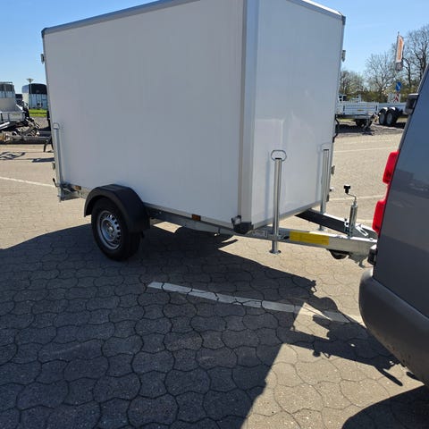 Overgaard Ventilation trailer med dobbel aksel. Trailerens indvendige rum er udstyret med opbevaringsplads og arbejdsborde, egnet til transport og opbevaring af værktøj og materialer til ventilationsarbejde.