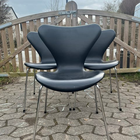 Flotte syverstole polstret i sort læder. Stolene er designet af Arne Jacobsen og produceret hos Fritz Hansen - model 3107. Stolene er af ældre dato og fremstår i god stand - med hård ryg. Stolene har aldersrelaterede brugsspor.