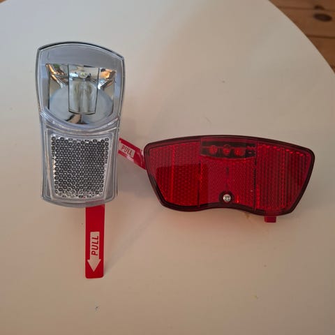 Helt nye cykel lygter, stadig i indpakning.