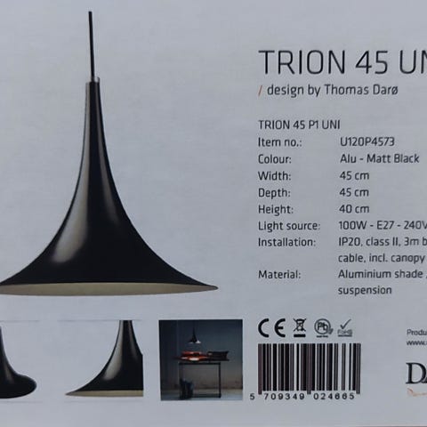 Trion er designet ud fra originale værdier, hvor dette design så dagens lys første gang i starten af 80´erne. Trion er en moderne lampe, der kan skabe lys og hygge.Vejl pris er 2550,- kr. Sælges som direkte lager salg.