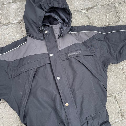 Dragten er brugt og har to ubetydelige slitager: Nederst trykknap mangler og syning er gået op få cm nedenfor frontlynlåsen. Ingen betydning for brug og komfort.