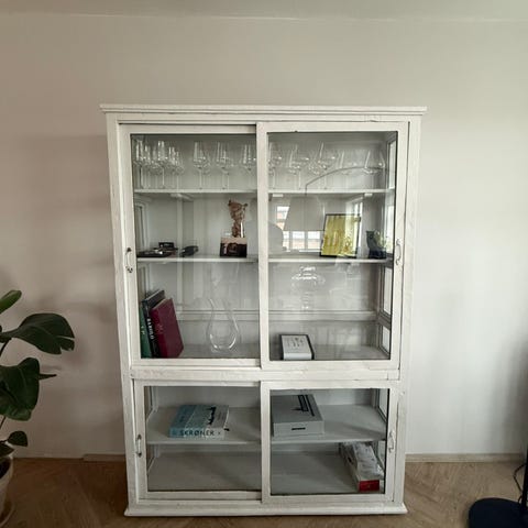 Jeg sælger mit flotte vitrineskab fra The traveling band (hjemmeside https://thetravellingband.dk/products/vitrineskab-tt32-90x46x190-cm). De laver kun én af hver model, så det er et skab, man ikke finder andre steder. Det er i rigtig pæn stand da det kun er blevet brugt til opbevaring af vinglas osv.