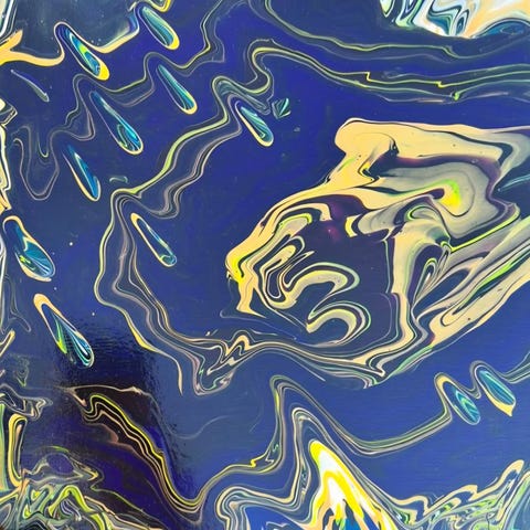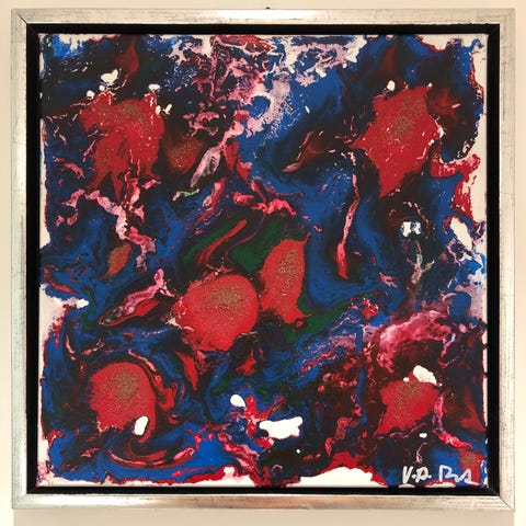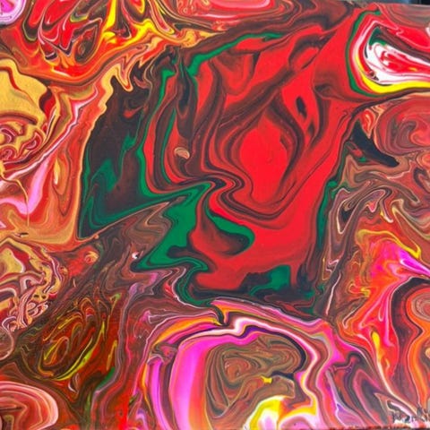 Abstrakt maleri med flydende farver i røde, grønne, gule, rosa og brune nuancer. Maleriet er udfort pả larred og viser en blanding af organiske former og monstre. Velegnet til dekoration af vagge i hjem eller kontormiljøer. 30x30cm
