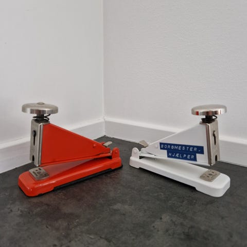 FOLLE 24 -Hæfteklammerapparat i metal med grå farve. Designet til manuel brug til sammenføjning af papirer. Kompakt størrelse og enkel funktion.