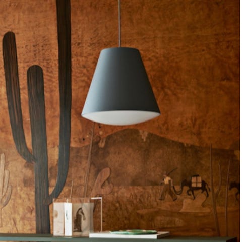 Indeni skærmen sidder den buede diffuser, der skjuler lyskilden og forhindrer at lyset blænder. Det gør at lampen giver et blødt og behageligt lys.