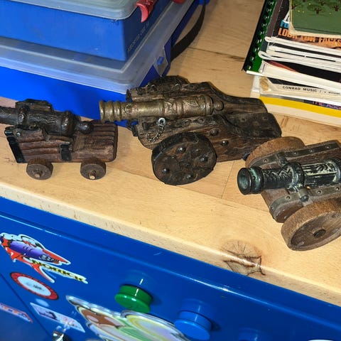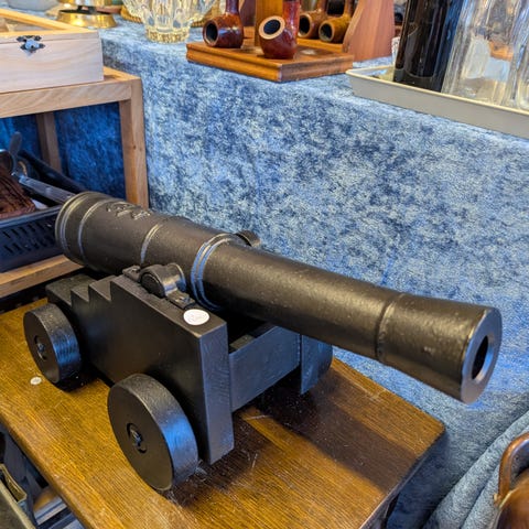 Salutkanon med træstel og metalkanon. Kanonen har hjul og detaljer i metal og træ, der efterligner en historisk kanonmodel. Passer til dekoration eller samling. Linene Set vurderet til over 1000kr .