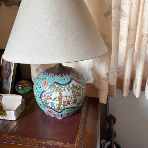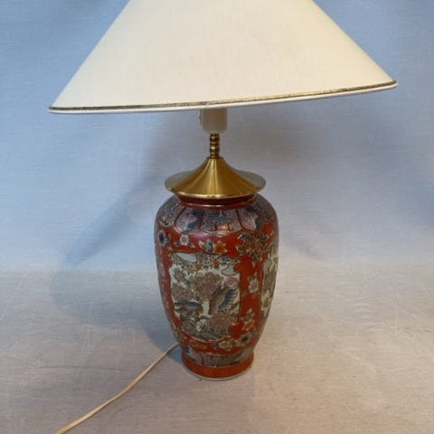 Lampens stel er dekorativt med malerier af fugle og planter. Den er lavet af porcelæn og metal.,Afhentes i:,Røde Kors Horsens (615),Bemærk at mail, chat og beskeder ikke besvares, og varen skal købes på knappen "Gå til varen"