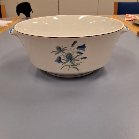 Skålen har en rund form med to håndtag og en glat overflade. Den er lavet af keramik.,Afhentes i:,Røde Kors Horsens (615),Bemærk at mail, chat og beskeder ikke besvares, og varen skal købes på knappen "Gå til varen"