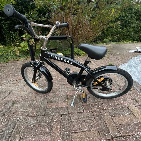 Super startcykel i flot gul farve, 14 tommer hjul. Cyklen er brugt 1 sæson (købt november 2024). Cyklen har støttehjul (kan nemt afmonteres), kædeskærm og et justerbart sæde i brun.