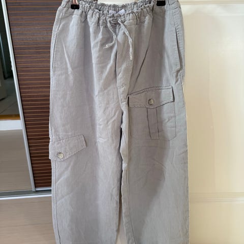 Lækre bløde og løse sommer bukser med elastik i taljen. 100% bomuld. 2 små farveforskelle på numsen. Kan temmelig sikkert fjernes men er ikke forsøgt.