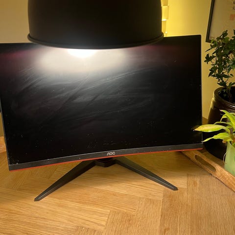 AOC 24" skærm med standard tilslutningsmuligheder inklusive HDMI. Skærmen har en rund fod og en sort ramme.
