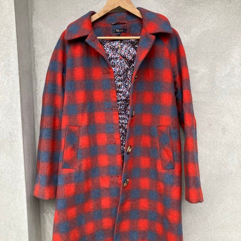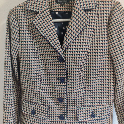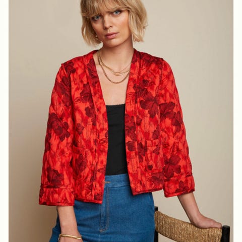 Smuk rød vatteret quiltet jakke fra King Louie. Brugt 2 gange og er kun luftet, ej vasket. Fremstår i perfekt stand. Perfekt til julens fester, men er også bare utrolig smuk og kan dresses både op og ned.