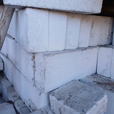Byggemateriale bestående af mursten og Byggemateriale Mursten og kalksandsten sokkel, til en trappetrin tråde sten i forskellige størrelser og farver. Materialerne kan anvendes til opførelse af vægge, fundamenter og andre konstruktionsformål.
