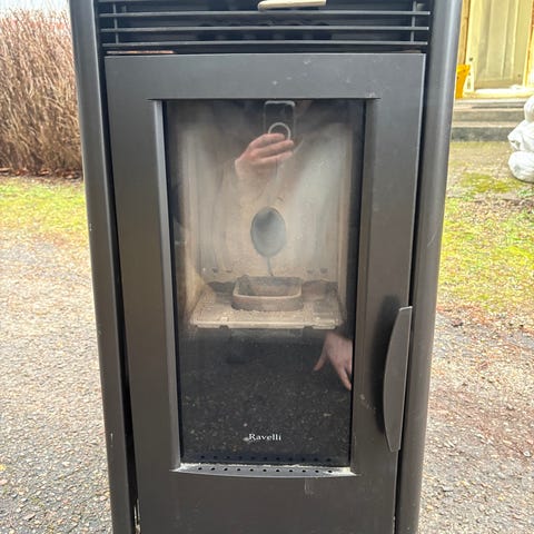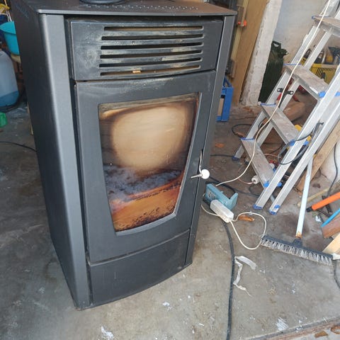 Pelletsovn i rød farve med glasvindue og kontrolpanel. Designet til opvarmning med pellets som brændsel. Kompakt størrelse egnet til boligopvarmning.årgang 2018 , lidt Prb. med styringen