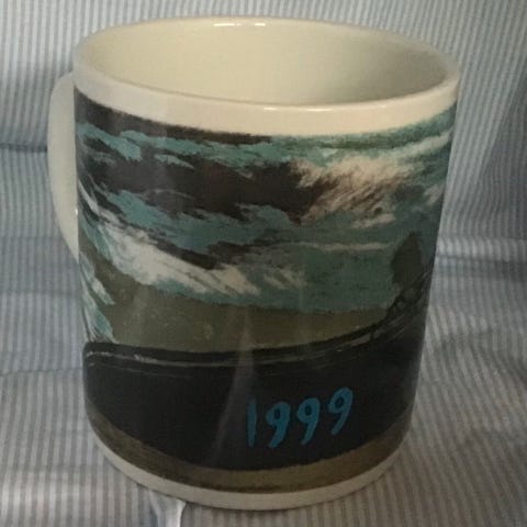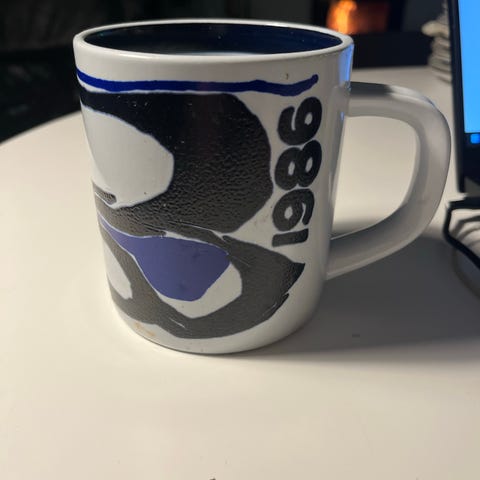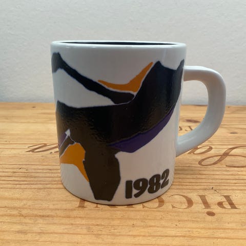 Årskrus 1982 krus med grafisk design i sort, orange og blå farve. Fremstillet i porcelæn.