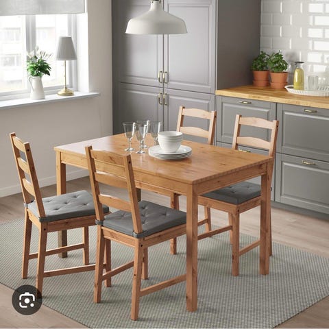 Robust spisebord og 3 stole. Ekstra stol kan til købes i ikea. Ekstra bordplade medfølger til forlængelse af bordet.