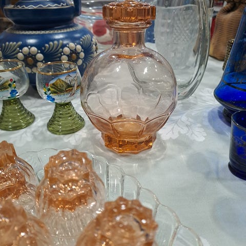 Glas karaffel med mønster. Karaffelen er firkantet med et dekorativt stjernemønster skåret i glasset. Den har en matchende glasskork. Egnet til oppbevaring av drikkevarer.