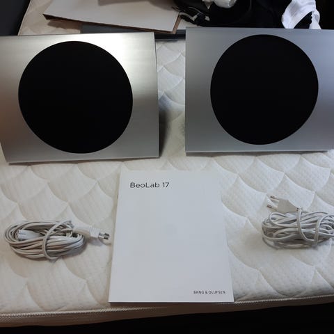 Bang & Olufsen højttalere i sølvfarvet aluminium. Designet til at levere lyd med fokus på æstetik og funktionalitet. Med vægbeslag.