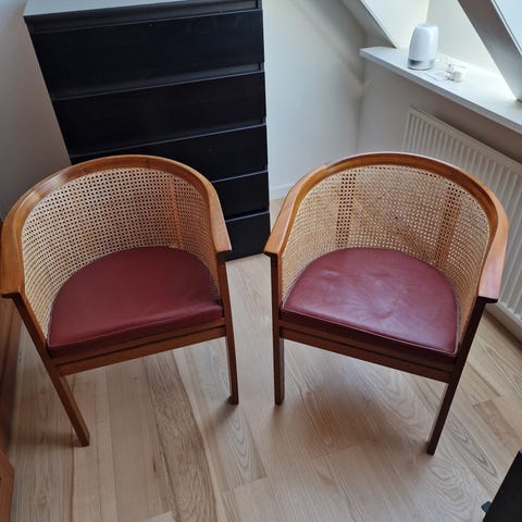 Til begge stole er mørkt læderhynde i virkelig god stand.