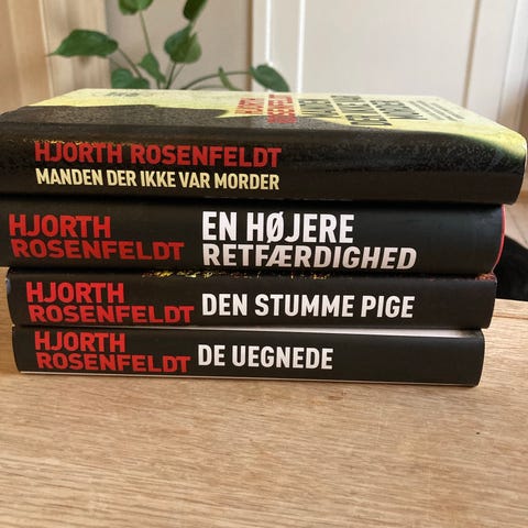 Hjorth Rosenfeldt bogpakke bestående af fem bøger: Manden der ikke var morder, Den Stumme Pige, En højere Retfærdighed, Disciple, og Fjeldgraven. Alle 5 bøger 100 kr eller stk25