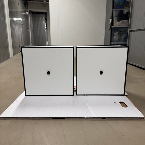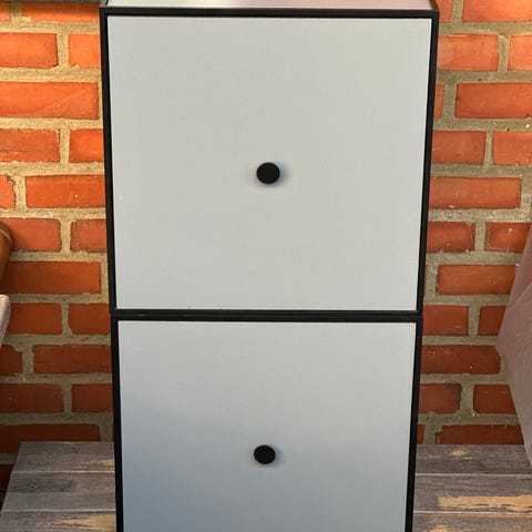 2 originale By Lassen Frame 42 moduler i hvid med låge. Ikonisk, minimalistisk dansk design af Mogens Lassen. Kan bruges som vægmodul, reol, vitrineskab, natbord eller sideboard og indgår i det fleksible Frame-system, som let kan udbygges.