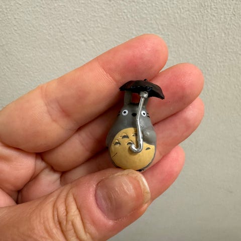 Legetøjet forestiller figuren Totoro fra Studio Ghibli og har et lille stoftilbehør fastgjort til siden.
