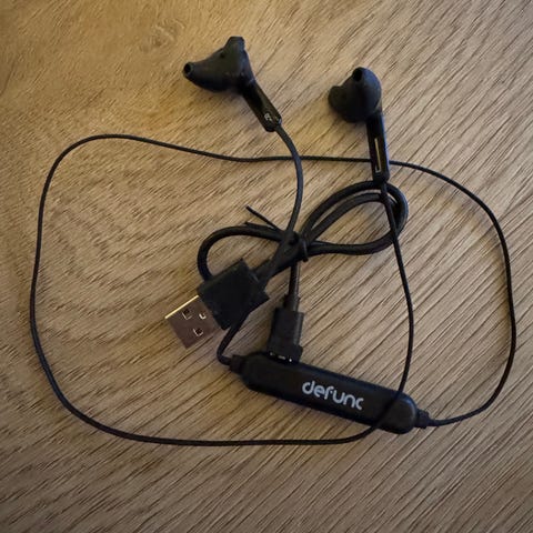 Defunc True Go trådløse øretelefoner i mørkeblå farve. Inkluderer opladningsetui. Designet til trådløs brug med indbygget mikrofon og touch-kontrol.