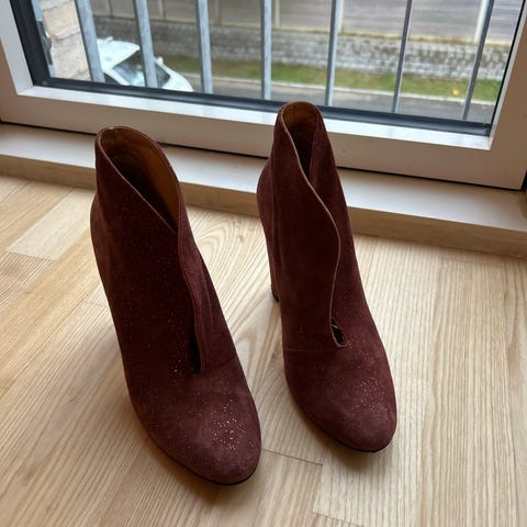 Ganni højhælet sko i størrelse 39 og sort farve. Skoene har en åben tå og ankelrem, samt en hæl af moderat højde. Materialet ruskind.