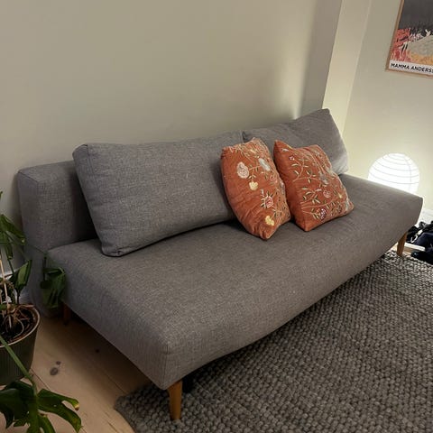 Sofaen er i god stand men topmadras og selve sofaen har nogle brugsspor.