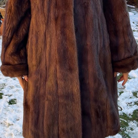 Elegant og fyldig minkpels i flot stand. Pelsen er blød, varm og glansfuld med et klassisk, tidløst snit. Passer perfekt til dig, der ønsker en luksuriøs og komfortabel pels med rummelig pasform.