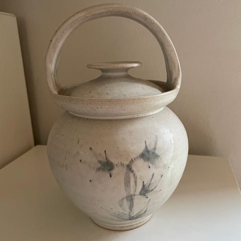 Rigtig fin og dekorativ lertøjs barselspotte / barselskrukke fra 1800 tallet. Meget velbevaret. Har få lette afslag i glasuren ved kanten i toppen (se billeder) og et enkelt indeni i bunden. Se desuden billederne for yderligere stand.