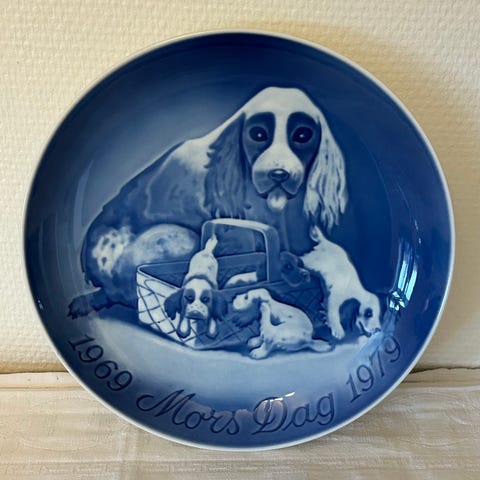 Stor (23 cm) Bing & Grøndahl 10 års Mors dag jubilæumsplatte fra 1979. Motivet er det samme som anvendt på Bing & Grøndahl Mors dag platte fra 1969 og viser en cocker spaniel med et kuld hvalpe. Perfekt til påskefrokosten. Alle platter er pæne og uden skår.