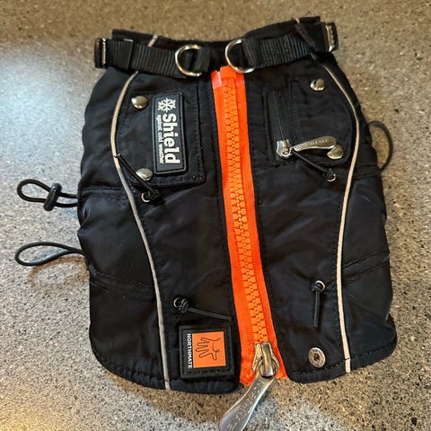 Hundefrakke med “my little princess” på ryggen. Nem at tage af og på. Passer til lille hund. Min egen Shih Tzu kunne passe den som hvalp men ikke som voksen.