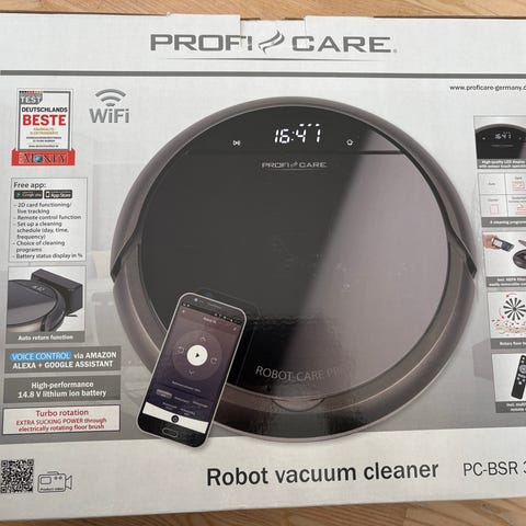 Liectroux robotstøvsuger med tilbehør inkluderer oplader, ekstra børster og fjernbetjening. Enheden er rund og sort, designet til automatiseret gulvrengøring.