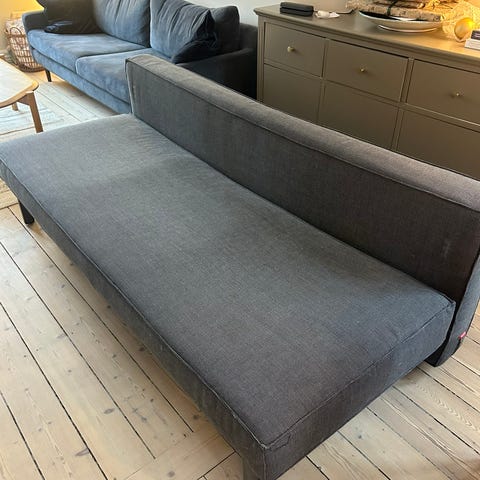 Sort sovesofa med god plads til opbevaring under. I fin stand, men afbleget af solen i det ene hjørne. Skal bæres ned fra 5. Sal. Afhentes gratis i Kastrup efter aftale