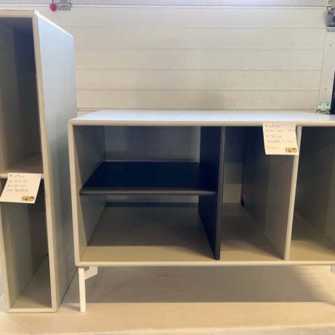 TV moduler fra Montana. De er i en mørkegrøn/oliven grøn farve. De er med vægophæng. De har flere ridser og skrammer som kan ses på billederne. Skydelåge på en modul skal have ny skinne som også medfølger.