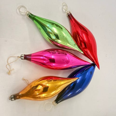 Flotte glas dråber til juletræet. De er gamle og fremstår med patina. Bemærk de er lavet i tyndt glas. Den guldfarvede mangler en del af spidsen og følger gratis med ved første køb af anden farve.