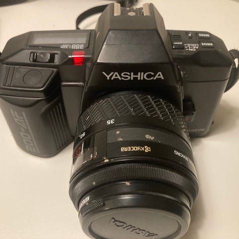 Yashica Z 108S kamera med indbygget flash og manuel filmindføring. Kameraet har et kompakt design og er velegnet til almindelig fotografering med film.