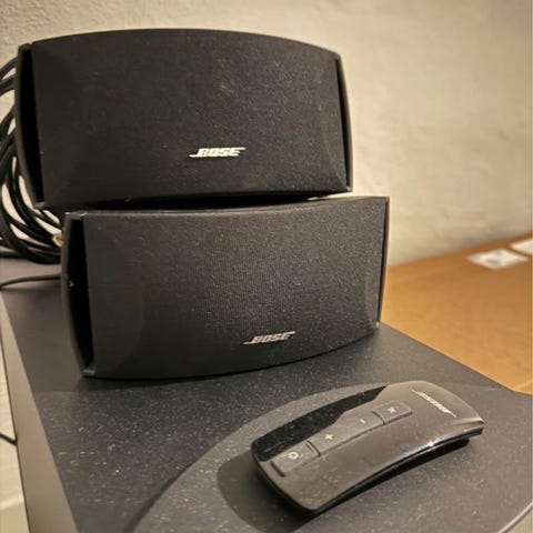 Setup kit til Bose CineMate 1 SR lydsystem med fjernbetjening, kabler og tilbehør. Skal bruges til at installere og kalibrere systemet.
