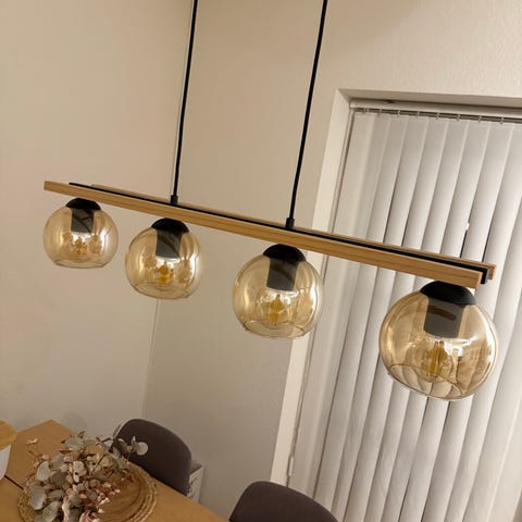 Loftlampe med seks hvide glaslamper og armatur i messingfinish. Lampen har justerbare arme og en moderne, minimalistisk stil, velegnet til opholdsrum eller køkken. Materiale: glas og metal (messing). Farve: hvid og messing.