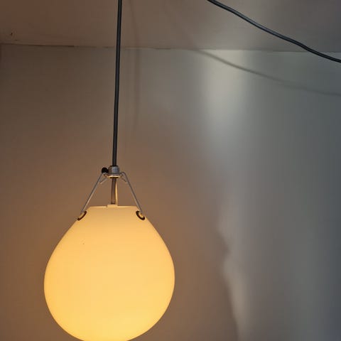 Inspiration er taget i glas mundblæst uden værktøj, hvor formerne indfanges i forskellige stadier. Afskærmet 100 pct for direkte synlighed af lyskilden. Ophæng er patenteret.