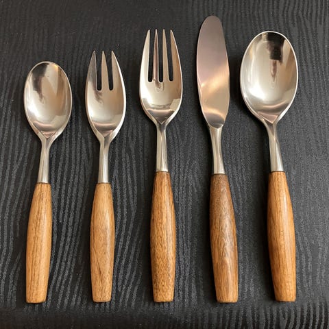 Ni spiseskeer i serien Fjord af den danske designer Jens Quistgaard. Rustfrit stål og teaktræ. Produceres ikke længere.