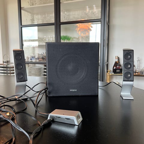 Subwoofer og højtalere, samt diverse kabler.