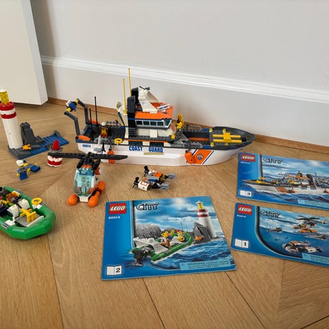 LEGO City redningssæt bestående af en firehjulstrukket bil, en trailer og en orange redningsbåd. Sættet inkluderer detaljer som redningsudstyr og minifigurer, og er designet til leg inden for LEGO City temaet.