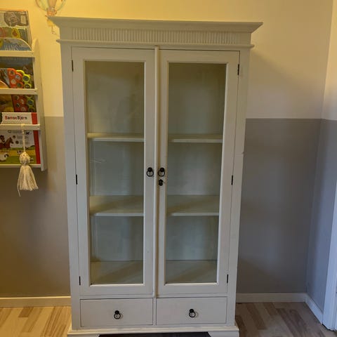 Smuk gammel vitrine med personligt touch. Kan lukkes og låses. Jeg har den til at hænge pt. Men der er også mulighed for at den står/kører på hjul. Hjul følger med.